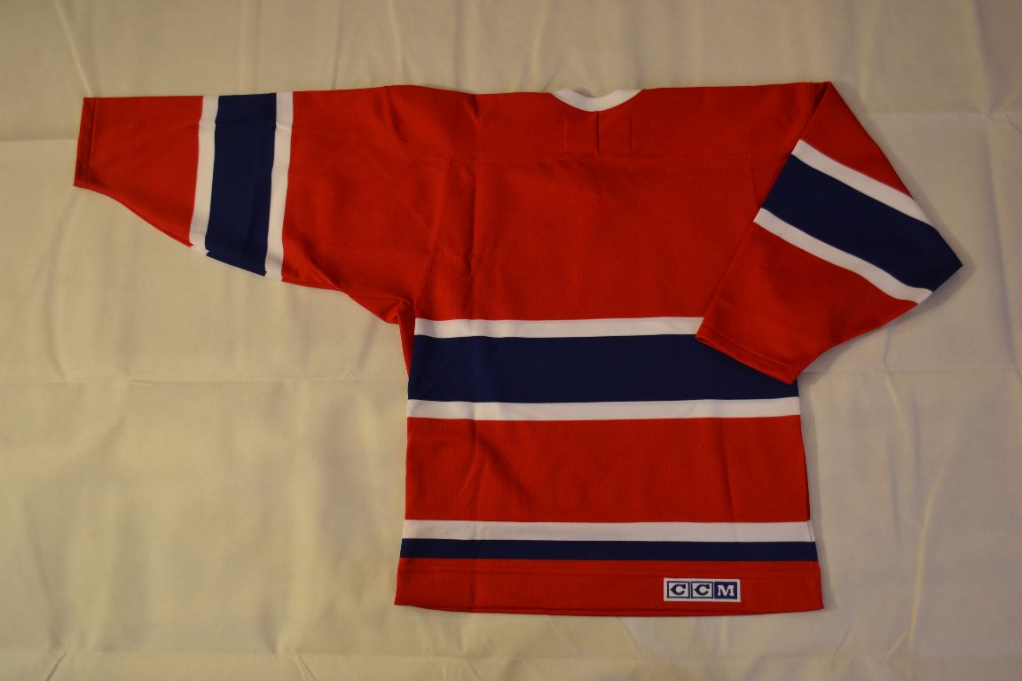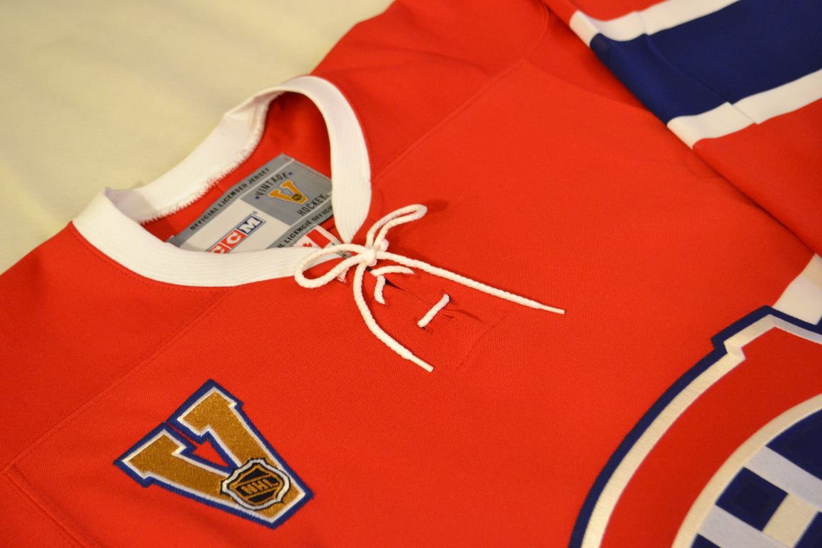The rendition featured here is a replica of the jerseys worn in the 1940s/50s and donned by greats such as Maurice Richard and Jean Belliveau. While very similar to the regular away jerseys worn by the Canadiens in the 90s and 2000s, differences include the all-white collar and laces.